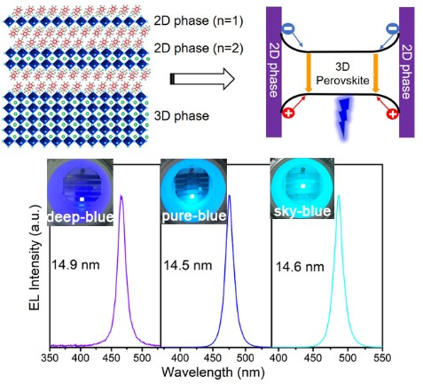 Recently, Professor Chen Daqin’s research team of College of Physics and Energy of FNU reported a 2D/3D heterostructure perovskite by long-chain organic halide salt post-treatment in blue perovskite light-emitting diodes (PeLEDs), and PeLEDs with tunable blue emissions (sky-blue emission at 465 nm, pure-blue emission at 475 nm, and deep-blue emission at 486 nm), featuring precise spectral tunability, ultrapure blue emissions (FWHM <15 nm), and reasonable spectral stability, were demonstrated. The work, titled “2D/3D Heterojunction Perovskite Light-Emitting Diodes with Tunable Ultrapure Blue Emissions”, was published in Nano Energy (IF = 17.882). FNU is the first organization of the paper, with Jiang Naizhong, a master candidate of FNU, as the first author, and Prof. Wang Zhibin and Prof. Chen Daqin of FNU as the corresponding authors. The work was funded by the National Natural Science Foundation of China and the Natural Science Foundation of Fujian Province.