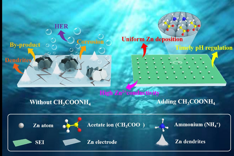 Recently, Professor Chen Qinghua and Professor Zeng Lingxing of College of Environmental Science and Engineering of FNU and Dr. Xiong Peixun of Sungkyunkwan University of Republic of Korea jointly researched and proposed that the introduction of a trace amount of ammonium acetate (CH3COONH4), which is a trifunctional electrolyte additive, in the conventional aqueous ZnSO4 electrolyte, through the preferential adsorption of NH4+ and CH3COO– on the surface of Zn metal anode, their pH buffering effect, and their promotion in the formation of the solid electrolyte interphases (SEI) with a high Zn2+ transference number, results in an increase in the stability of the Zn electrode/electrolyte interface, and a significant increase in the electrochemical reversibility of Zn anode at the ultrahigh current density of 40 mA cm–2 at the low-temperature of −10 °C and a dramatic increase in the cycling performance of different zinc-based energy storage devices such as Zn||MnO2 full cells and Zn||AC capacitors. This study provides new insights into the design of multifunctional electrolyte additives and effectively prolongs the cycle life of aqueous Zn-ion batteries at ultra-high current density. Entitled “High-Rate, Large Capacity, and Long Life Dendrite-Free Zn Metal Anode Enabled by Trifunctional Electrolyte Additive with a Wide Temperature Range”, the research result was published in the international authoritative journal Advanced Science, with FNU as the first organization, Lin Chuyuan, a master student of 2020-class of FNU, as the first author, Professor Chen Qinghua, Professor Zeng Lingxing and Professor Xiong Peixun as the corresponding authors and Dr. Yang Xuhui and Researcher Qian Qingrong as participants in the work.