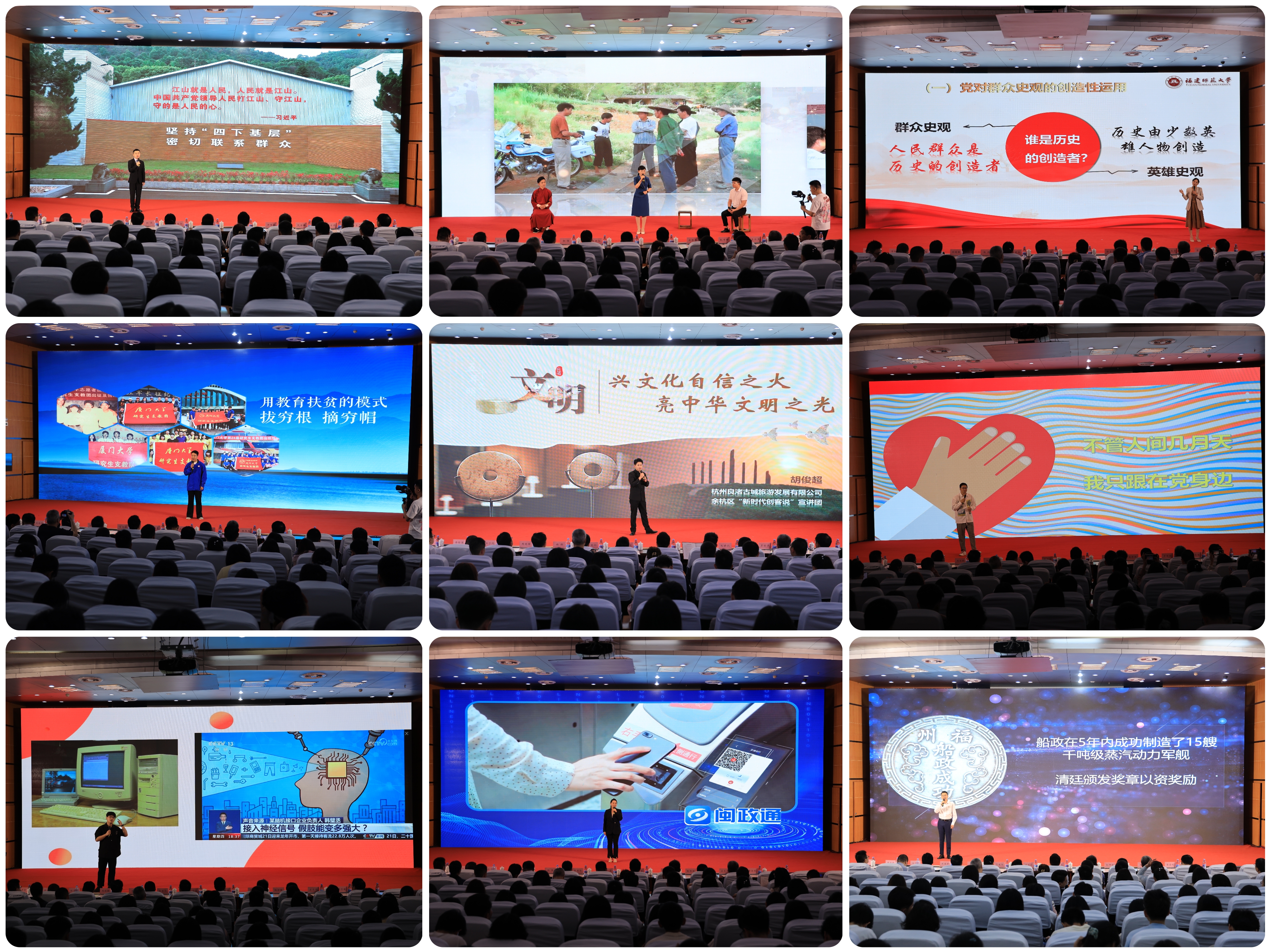 宣讲会上,福建闽东电力股份有限公司宁德发电分公司团支部书记徐林锋,诸暨市司法局暨南司法所所长孟柳霞、绍兴一方天研学旅游有限公司总经理方天和浦江县实验小学教师刘晓鹏,必一在线平台(中国)官网马克思主义学院副教授杨小霞,厦门大学公共事务学院硕士研究生石浩,良渚古城旅游发展有限公司社教专员胡俊超,浙江省中医药健康产业集团有限公司综合办公室副主任梁龙,衢州职业技术学院学生郑德镇,福建省大数据集团有限公司综合办公室主任助理杨绿汀,福建省马尾造船股份有限公司员工王睿琳分别作了题为“三轮车许可证背后的‘ 四下基层’故事”“社会治理的‘上’与‘下’”“温‘习’教育情,剖视哲学蕴”“青春,不以山海为远”“兴文化自信之火,亮中华文明之光”“谈谈中国式现代化”“发展新质生产力需要用好三种新思维“‘数’高千尺不忘根”“我们的征途是星辰大海”的互动宣讲。