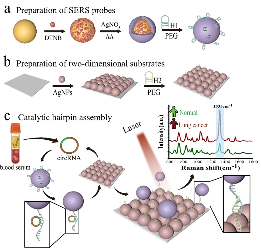 近日,光电与信息工程学院冯尚源教授、林多教授团队联合福建医科大学附属肿瘤医院许元基博士团队,在ACS Sensors (IF=8.9)杂志上发表论文“Optical Nanobiosensor Based on Surface-Enhanced Raman Spectroscopy and Catalytic Hairpin Assembly for Early-Stage Lung Cancer Detection via Blood Circular RNA”。研究结果显示,该团队研发了一种基于表面增强拉曼光谱(SERS)联合催化发夹组装(CHA)技术的光学纳米生物传感器,该传感器能够通过血液样本高效检测与肺癌发生发展密切相关的环状RNA(circSATB2),为早期肺癌的筛查和治疗提供新的方法。