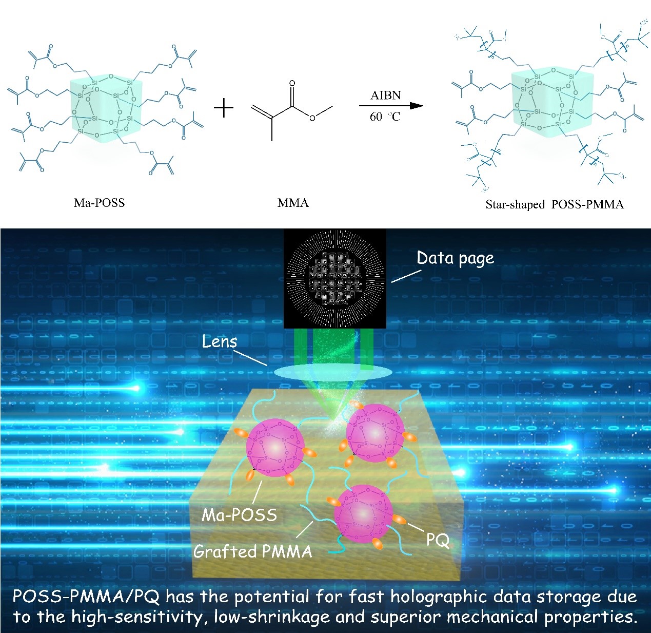 全息数据存储技术可以将二维数据页存储到三维介质当中,是实现快速高密度数据存储的前沿技术。但是,光致聚合物全息存储材料感光敏感度不足,极大限制了全息数据存储技术的推广应用。本研究通过自由基聚合和高分子枝接技术,把八甲基丙烯酰氧基聚倍半硅氧烷(Ma-POSS)引入到菲醌掺杂聚甲基丙烯酸甲酯(PQ/PMMA)光聚合物当中,制备了星型高分子光致聚合物POSS-PMMA/PQ。研究发现星型高分子POSS-PMMA可以显著提高PQ/PMMA光致聚合物的感光灵敏度(~ 5.5 倍)和衍射效率(~ 50%)。分析表明,POSS支链上大量残余的C=C键更容易与PQ发生反应以显著提升POSS-PMMA/PQ的光反应效率。并且,具有增塑剂作用的星型聚合物POSS-PMMA使材料结构更加松散,有利于光引发剂PQ的扩散形成光栅。同时,POSS材料的笼型Si-O-Si核心具有较好的结构强度,可以显著降低材料的光致收缩(~ 4倍)。该材料已经在同轴全息存储系统上得到验证,可以实现较低误码率(BER)和较高信噪比(SNR)的数据存储。
