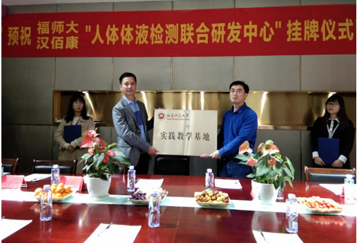 近日,化学与材料学院与福州汉佰康生物科技有限公司举行实践教学基地挂牌暨签约仪式。座谈会上,福州汉佰康生物科技有限公司总经理林志烽介绍了公司的发展情况及公司在医学尿液检测诊断等相关项目方面的技术及特点。双方就人才培养、学生实习、产品研发等方面达成共识。副教授卢玉栋代表课题组与林志烽签订了共建“人体体液检测联合研发中心”合作协议,副院长刘海清为实践教学基地授牌。签约仪式后,学院一行参观了该公司的生产车间、产品展厅。(化学与材料学院)
