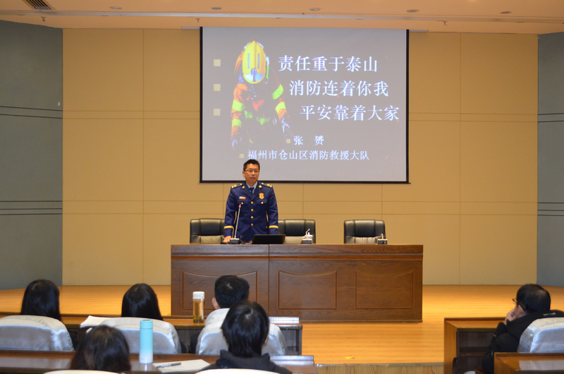 学院邀请了福州市仓山区消防救援大队一级指挥员张参谋为师生作实验室消防安全知识讲座。讲座围绕高校消防安全案例及事故原因、消防安全法律法规、消防设施配备及使用等作了深入细致的讲解,报告图文并茂、深入浅出,对师生树立消防意识,提升火灾预防、火情应急处置、火灾现场逃生等技能具有积极意义。