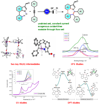 其中,研究成果一采用NH-吲哚导向策略,在阳极开展了过渡金属-电催化7-苯基吲哚与炔烃氧化环化的研究工作,发展了第一例[5+2] C-H/N-H环化反应,生成吲哚并七元环化合物(4,5-二苯基苯并[4,5]氮杂卓[3,2,1-hi]吲哚)。反应可以在连续流电化学合成装置进行克级放大。同时采用计量反应分离得到了两个关键的三价铑中间体,首次采用XPS对铑中间体在催化循环中的价态变化开展了研究,并通过循环伏安测试以及结合DFT计算对催化反应机理中的Rh(III-IV-II)路线进行了明确阐释。该工作成果以“Scalable Rhodaelectro-Catalyzed Expedient Access to Seven-membered Azepino[3,2,1-hi]indoles via [5+2] C-H/N-H Annulation”为题发表于中国化学会旗舰期刊《CCS Chemistry》。该论文必一在线平台(中国)官网为第一单位,化学与材料学院博士研究生苑雨萌和硕士研究生祝金兰为共同第一作者,汕头大学倪绍飞教授、必一在线平台(中国)官网黄秋锋教授和德国哥廷根大学Lutz Ackermann教授为共同通讯作者。