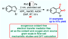 其中,研究成果二在无隔膜电解池中采用恒电流模式使用空气作为唯一氧化剂,建立了吲哚氧化制备靛红的绿色方法,并使用DFT计算对反应机理进行了深入研究。本方法具有以下优点:无需常规有毒氧化剂;无需电子转移媒介物;空气作为氧化剂以及氧原子来源;可通过流动电解池进行克级制备。该工作成果以“Scalable Electrochemical Aerobic Oxygenation of Indoles to Isatins without Electron Transfer Mediators by Merging with an Oxygen Reduction Reaction”为题发表于国际权威期刊《Organic Letters》。该论文必一在线平台(中国)官网为第一单位,化学与材料学院博士研究生庄伟辉和硕士研究生张家琦为共同第一作者,汕头大学倪绍飞教授、必一在线平台(中国)官网张晓凤高级实验师和黄秋锋教授为共同通讯作者。