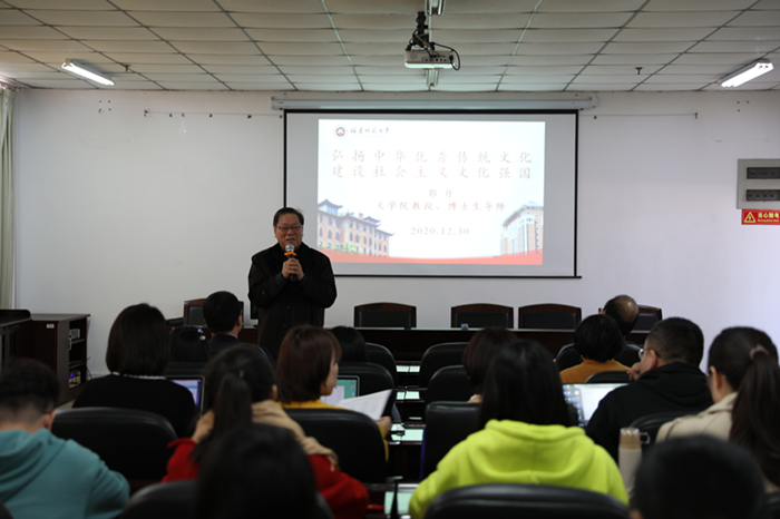 12月30日下午,校党委讲师团成员、文学院博士生导师郭丹教授应邀为传播学院师生党员作以“弘扬中华优秀传统文化 建设社会主义文化强国”为主题的讲座。讲座由院党委书记郑文灿主持,全体教师党员、学生党支部支委到场聆听了讲座。
